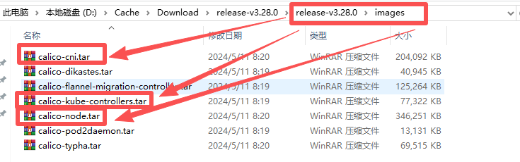 再自己电脑把release-v3.28.0.tgz用winrar软件解压后,calico-cni.tar、calico-node.tar、calico-kube-controllers.tar通过远程工具上传到3台服务器上即可。