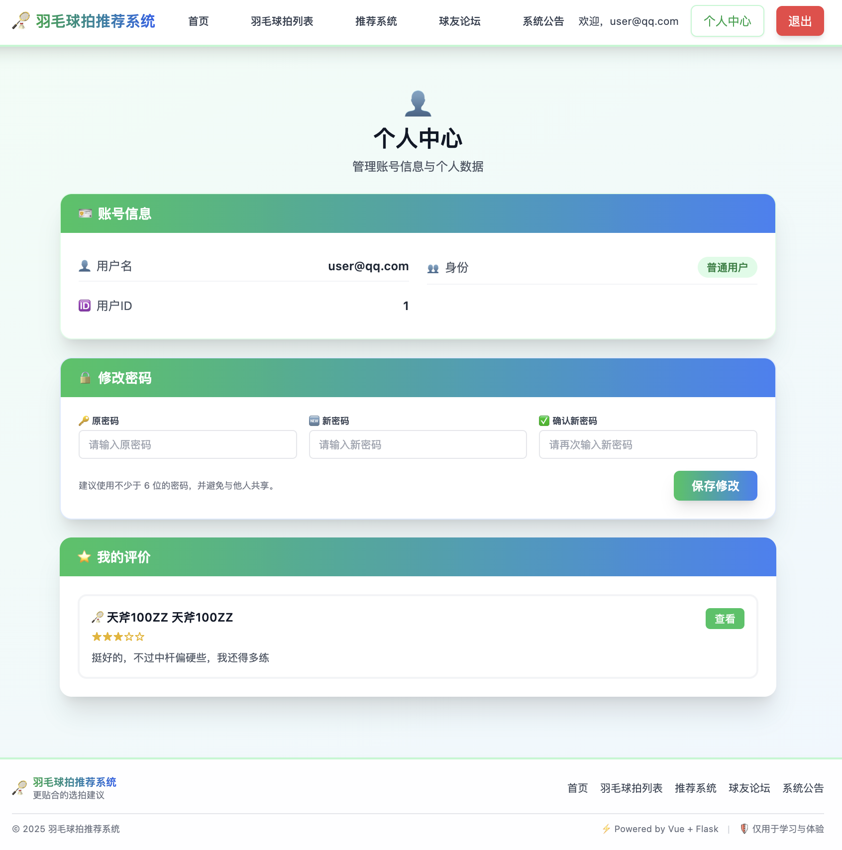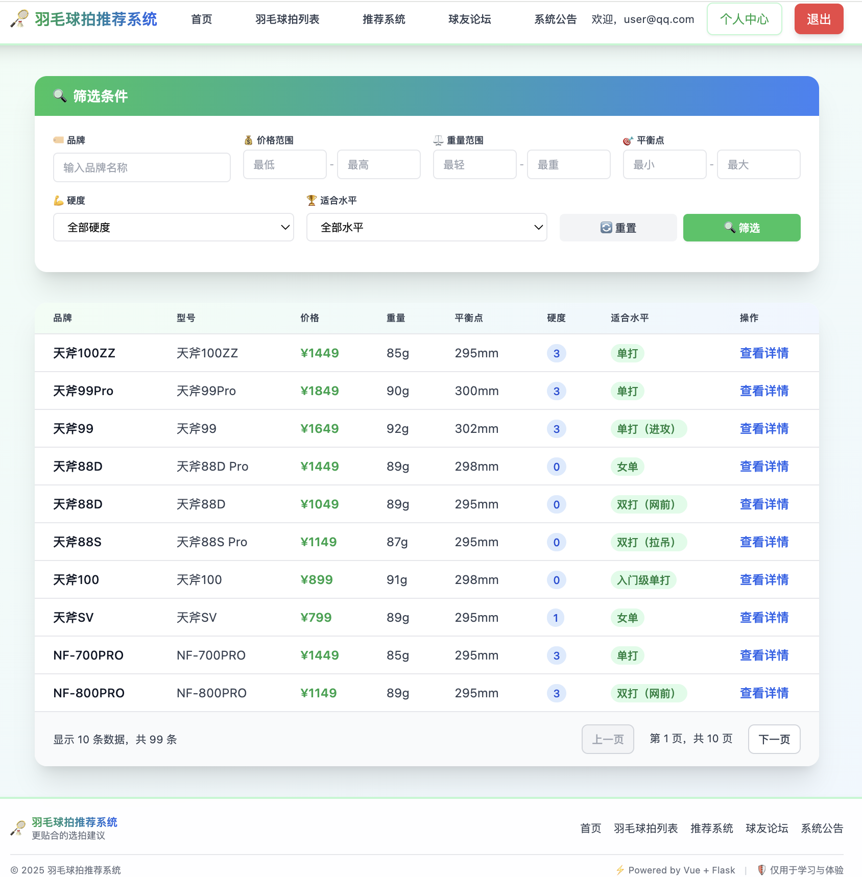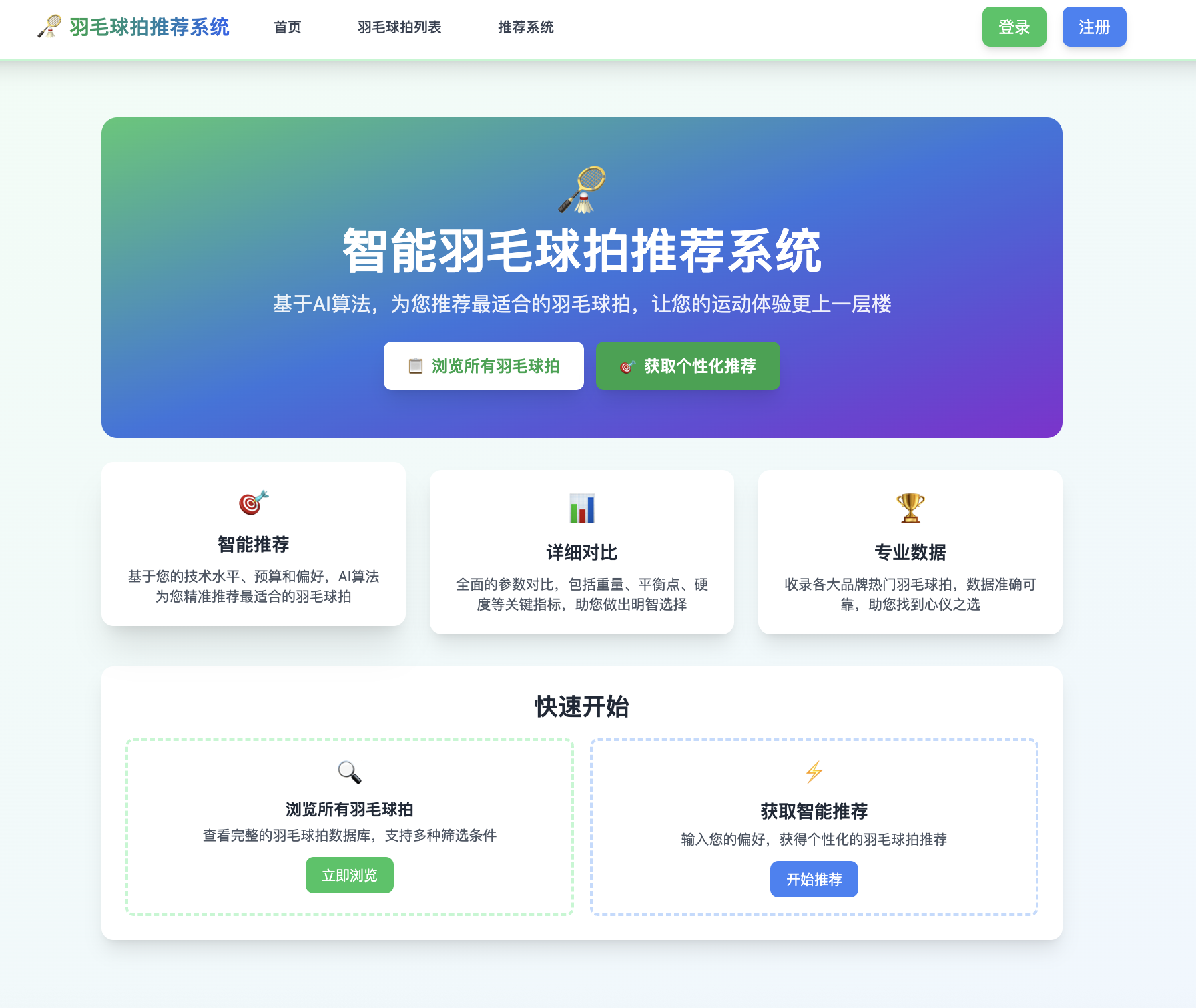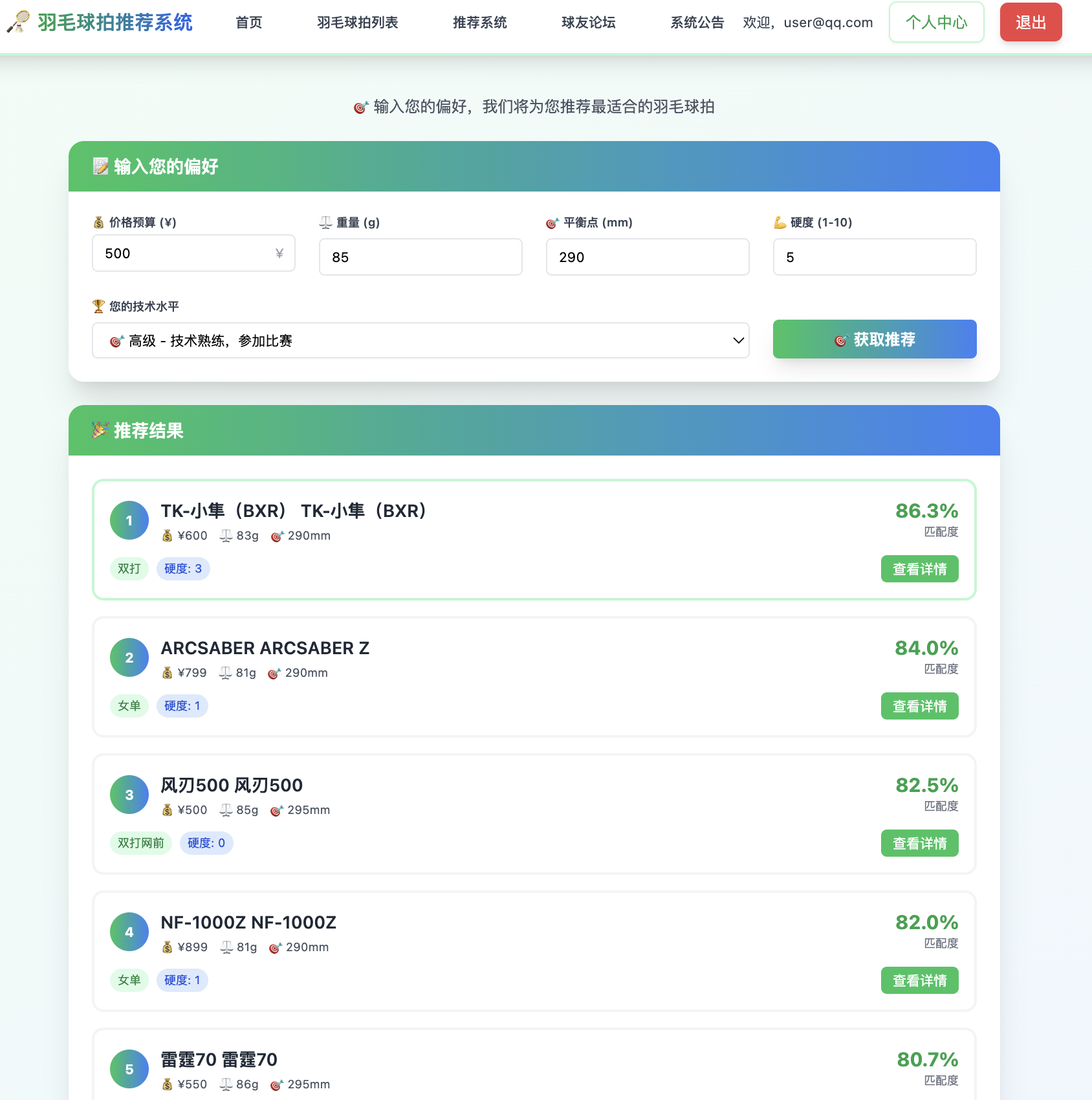 我把这些需求做成了一个「羽毛球拍推荐系统」,把选拍流程变得更可视化、更好用,也更适合日常自用、项目展示。