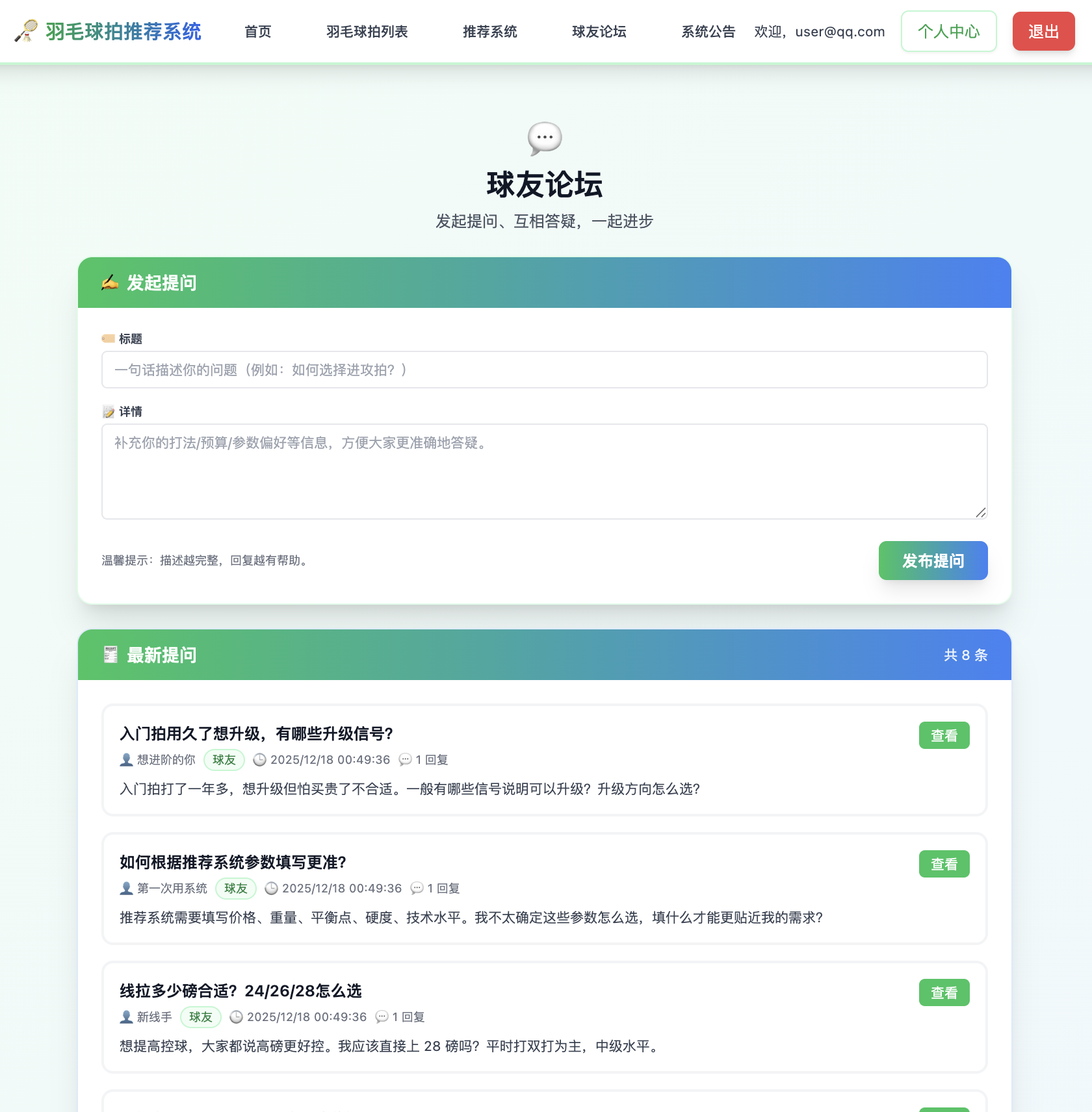这是一个面向羽毛球爱好者的 Web 系统,核心目标是把"选拍"从主观经验变成可输入、可对比、可解释的流程: