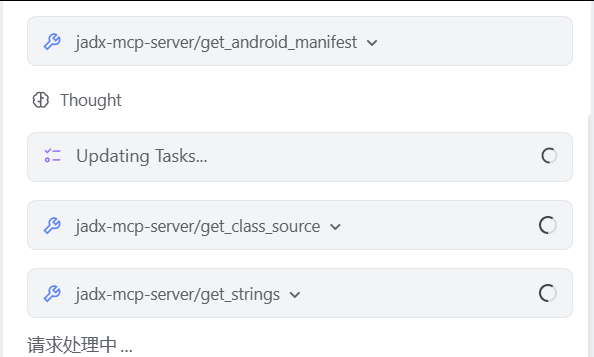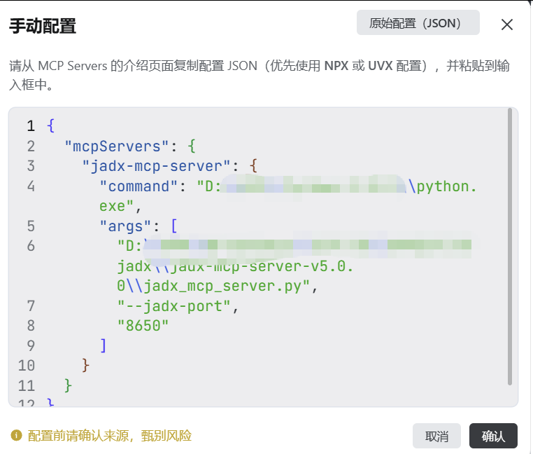 | { "mcpServers": { "jadx-mcp-server": { "command": "D:\\xxx\\xxxx\\python.exe", "args": [ "D:\\xxx\\xxx\\xxx\\xxx\\jadx-mcp-server-v5.0.0\\jadx_mcp_server.py", "--jadx-port", "8650" ] } } } |