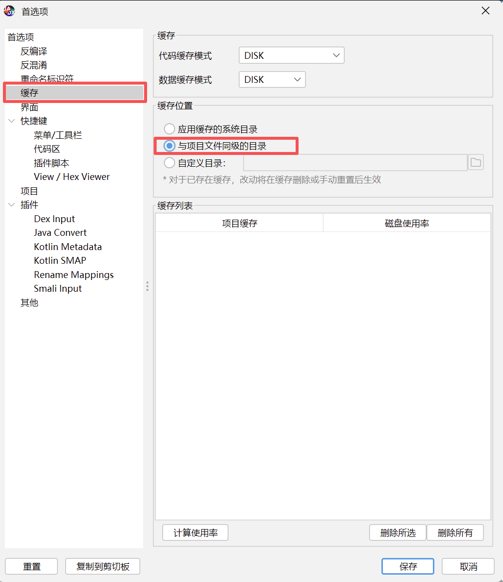 缓存配置:为避免缓存问题,需在Jadx中设置缓存路径(文件→首选项),建议配置为与项目同级目录,方便后期清理。