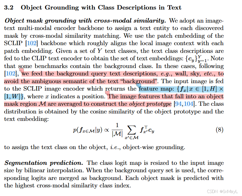 对于每一个二分掩码,作者是需要使用CLIP/SCLIP提取视觉特征,最后区域内所有特征求平均,得到类别原型 ,然后与文本嵌入匹配就行。