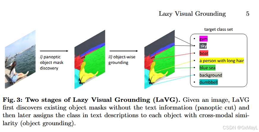 - 两阶段"先物后名"的训练自由 OVSeg(Lazy Visual Grounding)。