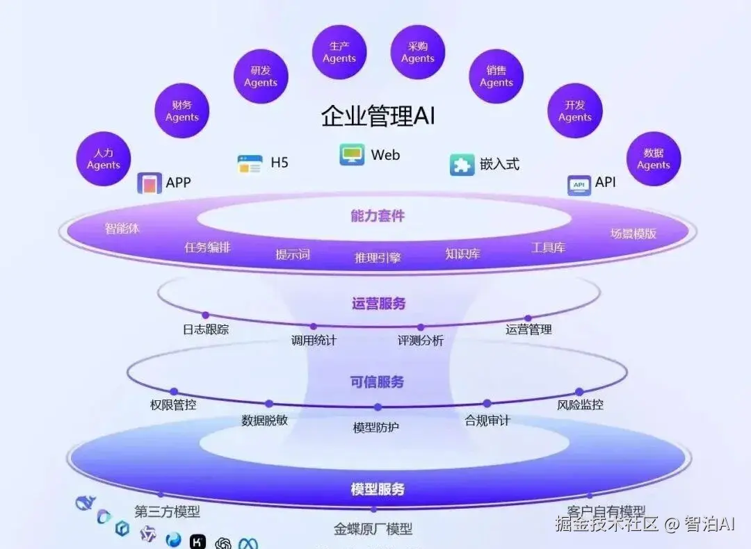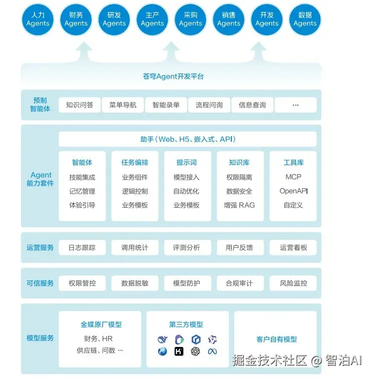 最近调研了国内厂商的解决方案,金蝶的苍穹Agent平台可以说是典型代表。其方法论并非从底层重构,而是依托30余年企业服务积累的业务经验,将Agent技术深度整合至现有企业管理体系中。