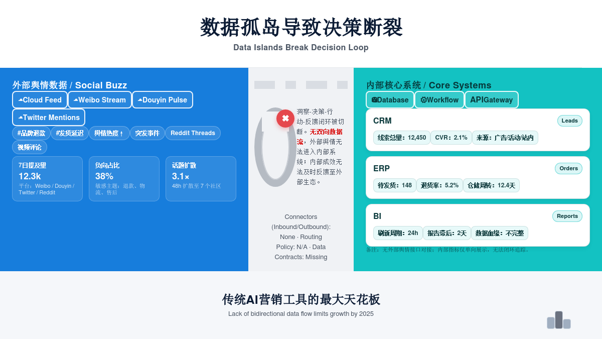 其次,它们在功能定位上更像是**"数据收集器",而非"决策赋能者"**。这些平台能告诉你"发生了什么",但很难回答"为什么会发生"以及"我们应该怎么做"。数据的流动是单向的,从外部世界流入平台的仪表盘,然后戛然而止。它无法与企业内部的核心数据系统,如CRM中的客户投诉记录、ERP中的供应链数据、PLM(产品生命周期管理)系统中的研发文档进行双向互动。例如,一个美妆品牌通过Synthesio Pro发现,社交媒体上对其某款新面霜"致痘"的负面声量在三周内上升了200%。但这一洞察是孤立的。决策者无法一键关联到内部系统,去查看这批次产品的质检报告、原料供应商信息,或是对比CRM中用户真实的售后反馈。这就导致了决策的断裂------市场部看到了舆情,却无法为产品部提供改进的精准依据;公关部紧急灭火,却不清楚问题的根源是营销夸大还是生产瑕疵。无法形成"洞察-决策-行动-反馈"的闭环,是这类传统工具在2025年面临的最大天花板。