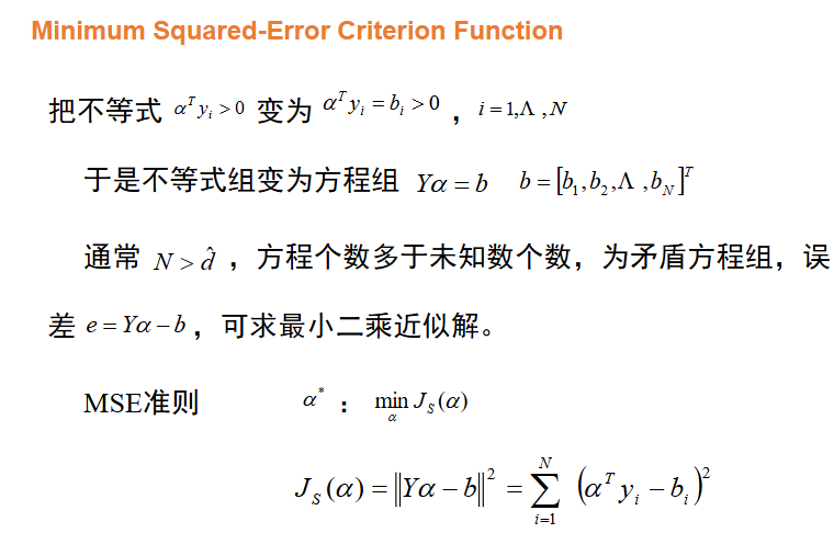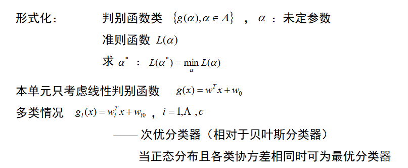 设定判别函数形式,用样本集确定参数,使用准则函数,表达分类器应该满足的要求,这些准则的最优并不一定于错误率最小相一致:次优分类器。
