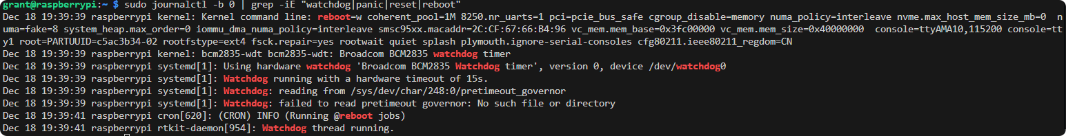 sudo journalctl -b 0 | grep -iE "watchdog|panic|reset|reboot"