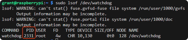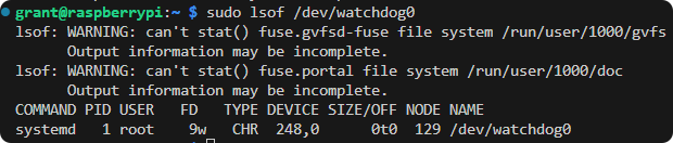 sudo ls -l /proc/1/fd/ 2>/dev/null | grep watchdog