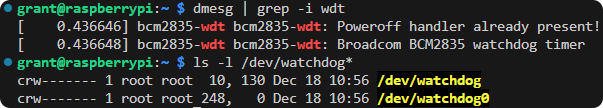 看到类似 bcm2712-wdt / bcm2835-wdt 或 /dev/watchdog0,说明内核已创建设备。/dev/watchdog0 是具体的看门狗实例设备节点,/dev/watchdog 是为兼容性提供的默认入口,用户态程序通过 /dev/watchdog 与看门狗设备交互,用户态程序也可以直接打开 /dev/watchdog0,效果等同于通过 /dev/watchdog