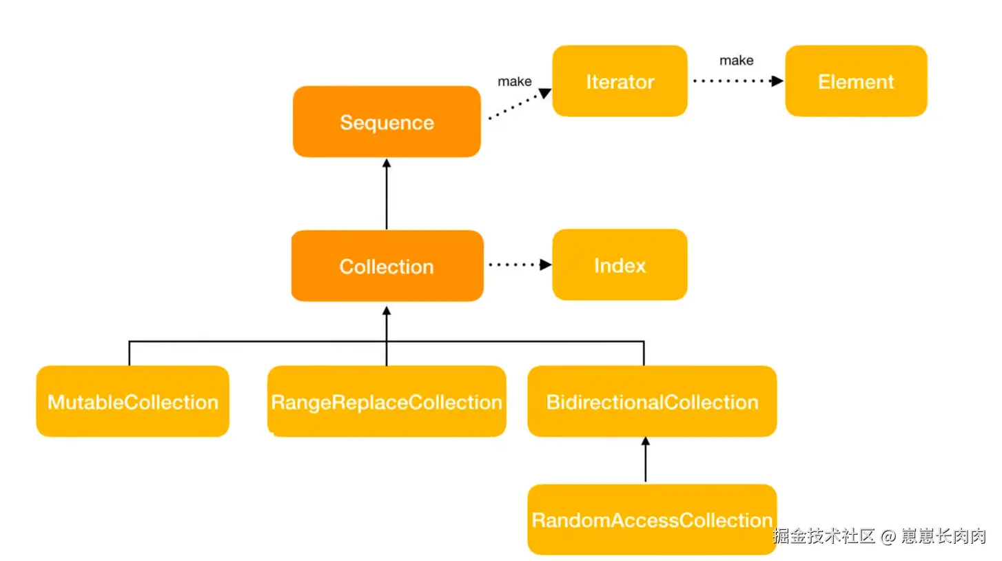 // collection可以额外保证:多次遍历且顺序稳定,提供count、endIndex、下标访问,支持切片、前缀、后缀等默认实现