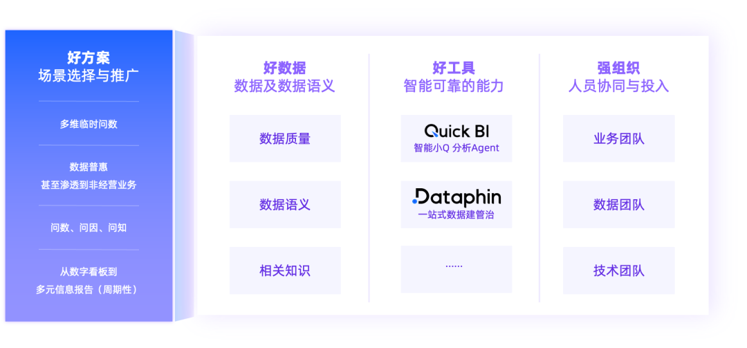 瓴羊基于与上百家头部企业的合作经验,发现数据分析Agent项目成功落地需具备四大特征:场景选择需与用户价值期待对齐并循序推广;数据准备是准确性与深度的基石;工具选择需要找到稳定可靠的企业级方案;组织上必须实现业务、数据与技术团队的深度协同。