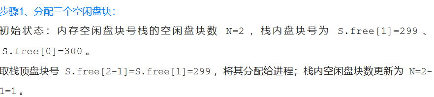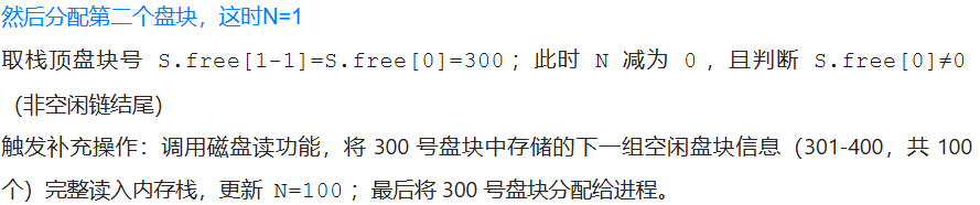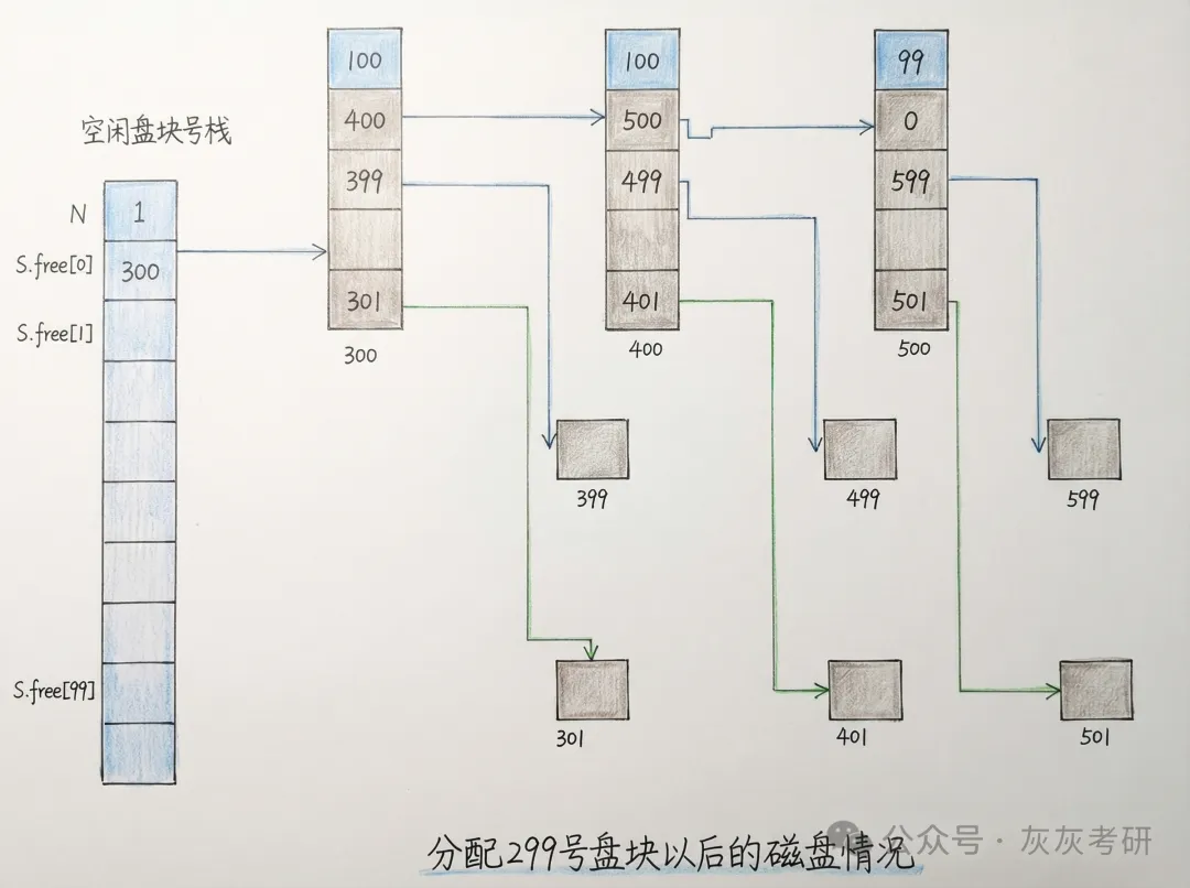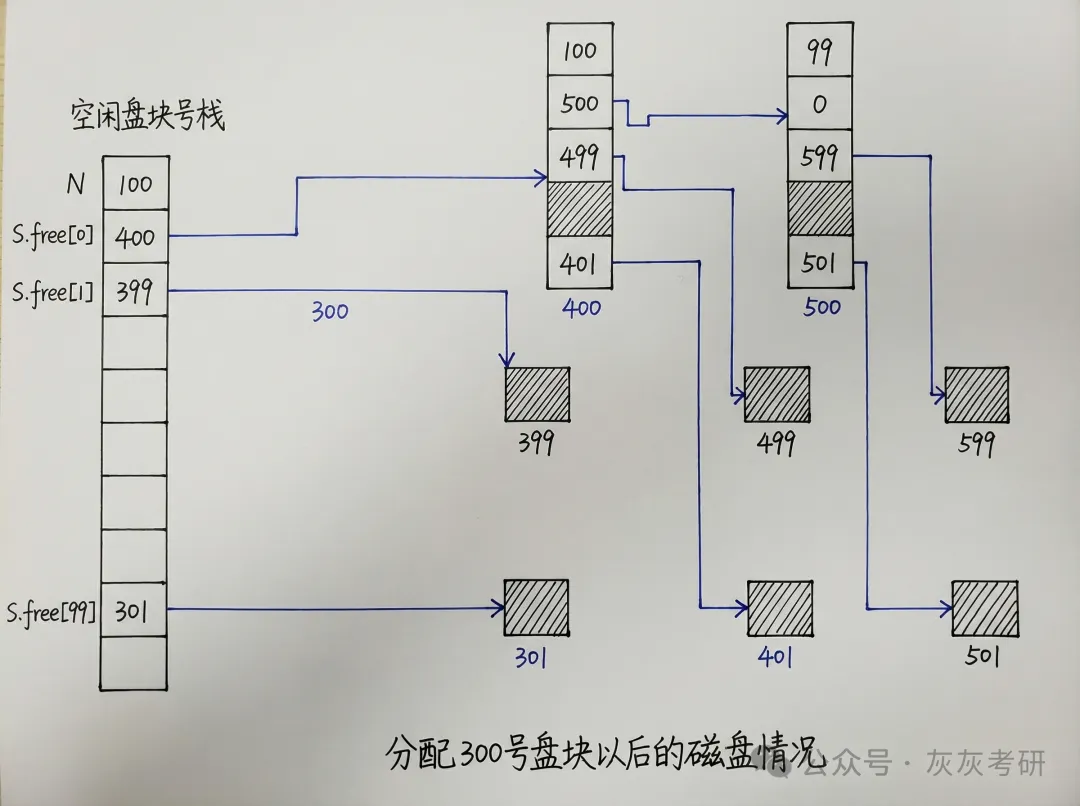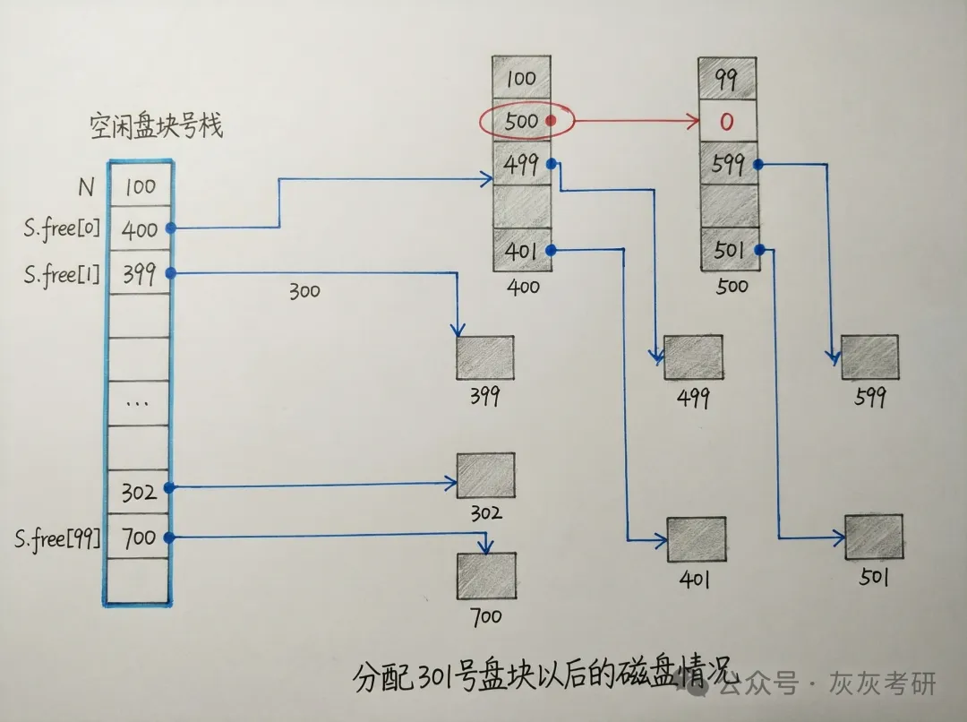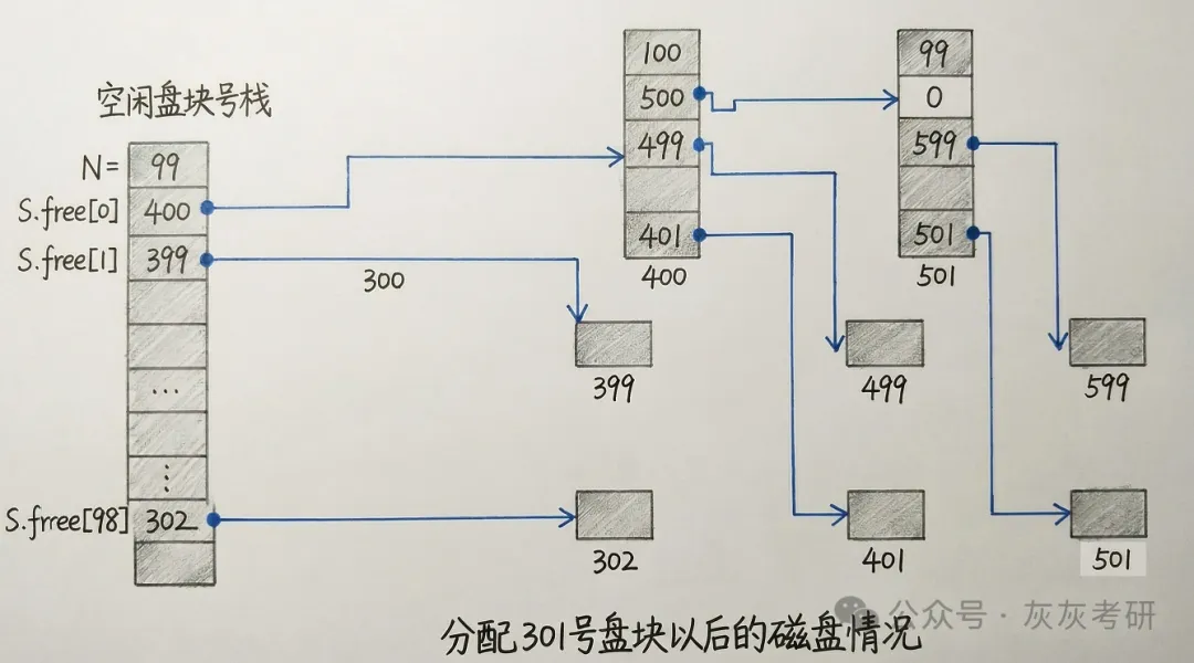 从更新后的内存栈中取栈顶盘块号(即 301 号),分配给进程;栈内空闲盘块数更新为N=100-1=99