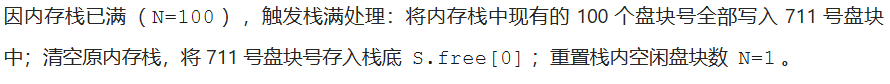 | 相关计算 | 设磁盘块大小为 B 字节,块号用 N 字节表示,则每组最多可容纳空闲块数为:(B / N) - 1(其中一项存下一组块号)。超级块栈大小通常为此值。 |