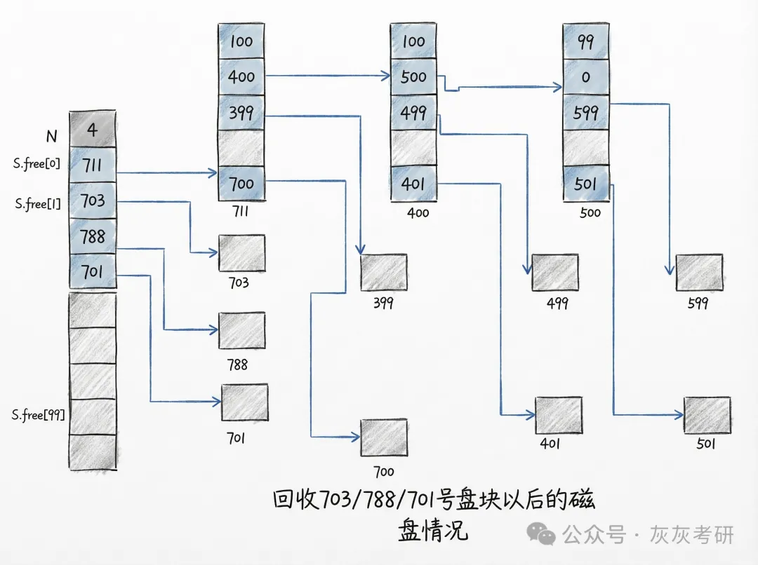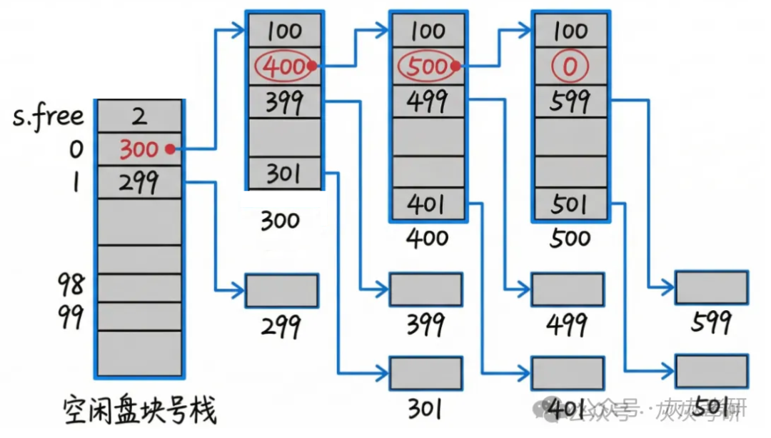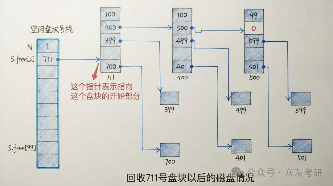 | 408 高频易错点 | 1. 栈空 / 栈满时的组切换逻辑2. 最末组结束标志(S.free (0)=0)3. 超级块同步机制(防止数据丢失) | 1. 栈空是加载下一组,栈满是创建新组2. 结束标志常作为选择题考点3. 超级块需保证内存与外存数据一致 |