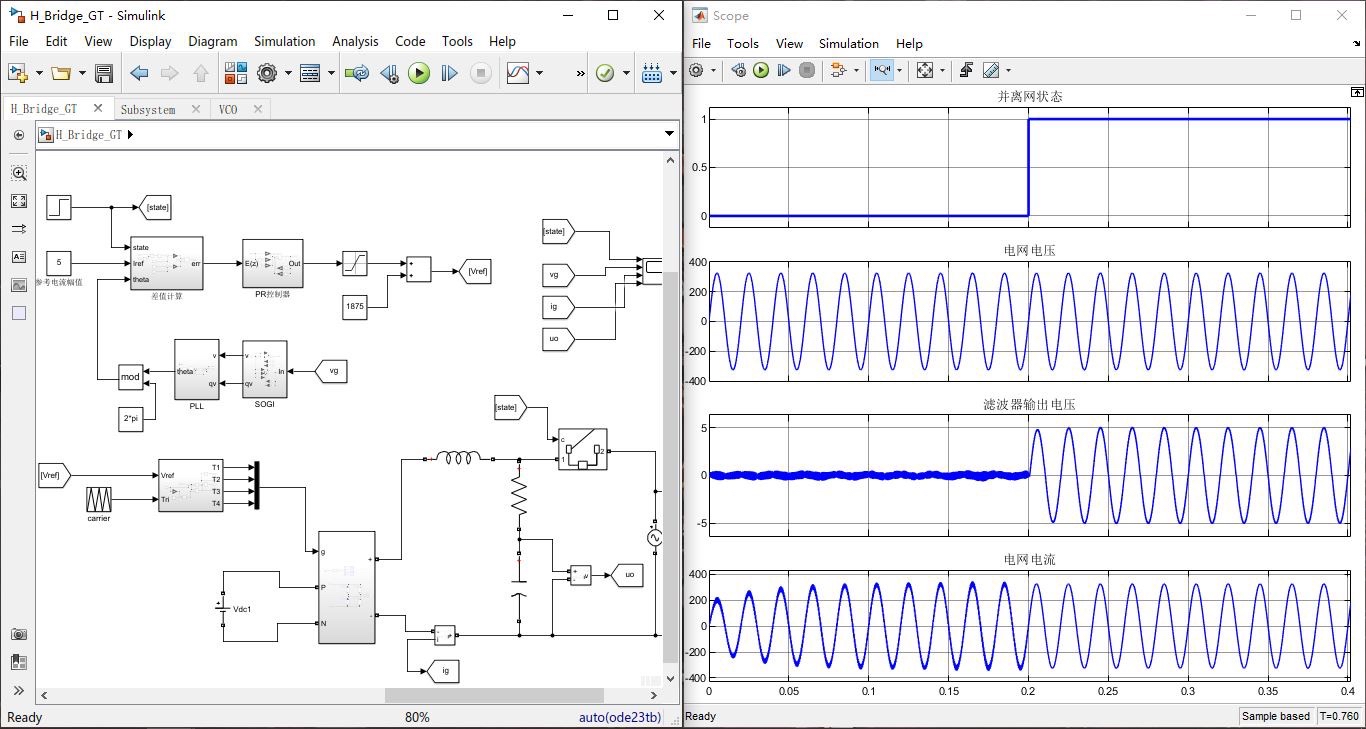 最近在折腾单相逆变器的并离网控制时,发现用Simulink做离散化仿真真是能避开不少坑。这次做的全桥拓扑结构,重点实现了离网到并网的无缝切换,调通那刻看到示波器曲线平滑过渡,直接治好了我的波形强迫症。