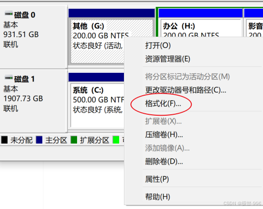 2、磁盘管理格式化:功能全,适合分区 / 修复硬盘