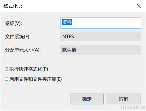 弹出格式化窗口,重点选 "文件系统"------Windows 用户优先选 " NTFS "(支持大文件、加密、权限设置,适合本地硬盘);U 盘、移动硬盘选 "FAT32"(兼容性强,能在 Windows 和 Mac 上用,但单文件不能超过 4GB)或 "exFAT"(兼顾兼容性和大文件,单文件无限制,首选!);