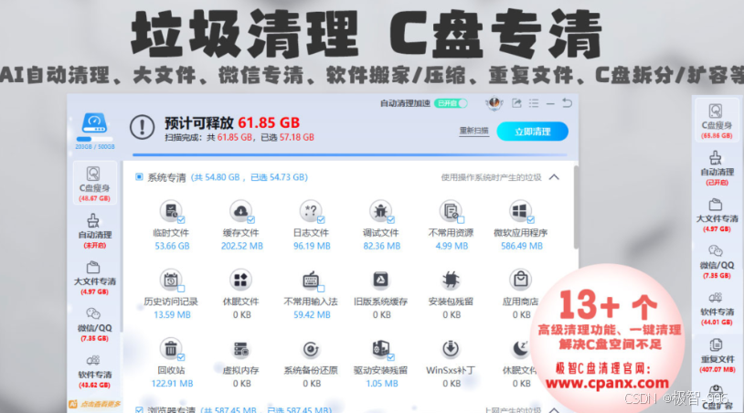 格式化后,若电脑存在缓存垃圾文件残留,可以点击文章尾部的官网链接卡片 ,前往其官网并使用极智C盘清理软件的磁盘垃圾清理功能来清理缓存垃圾文件,保持系统干净清爽,远离系统卡顿。