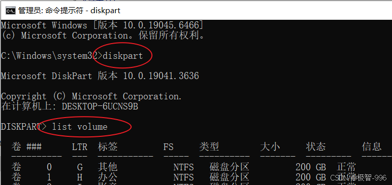 输入命令 "diskpart",回车后输入 "list volume",回车后会显示所有硬盘分区的盘符(比如 "卷 3" 对应 D 盘,"卷 4" 对应 U 盘),记住要格式化的盘符(比如 D 盘对应的 "3");