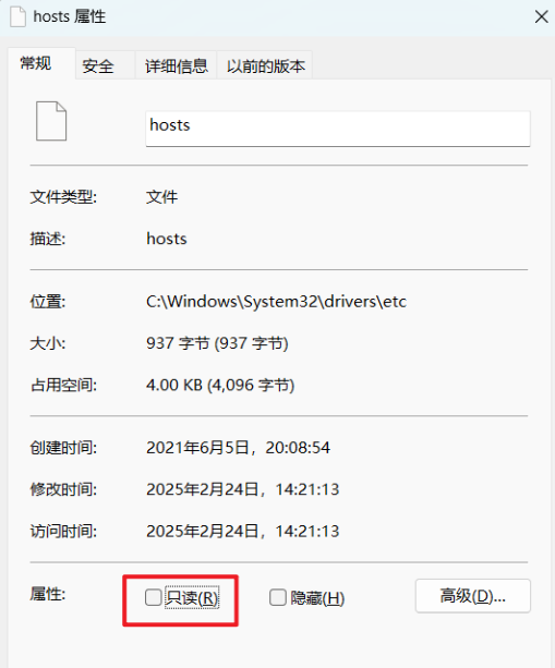 找到hosts文件>右键>属性,如果此时只读属性是被选中的,请取消选中后>点击应用并确定,SwitchHosts即可正常使用