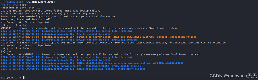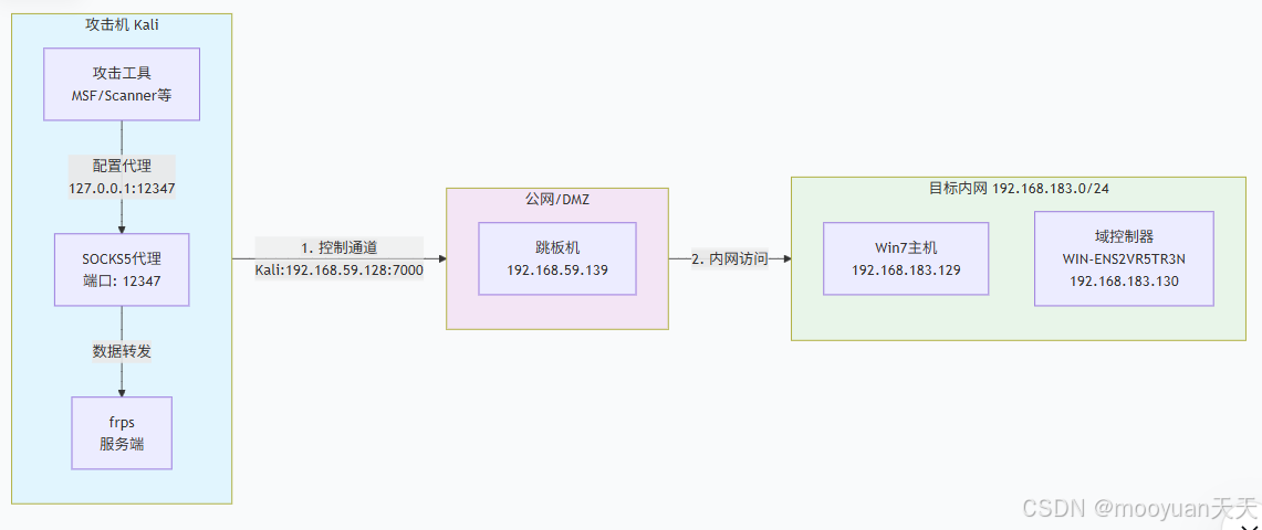 - 4. 代理搭建:配置FRP建立稳定Socks5隧道,确保Kali可通过FRP代理直接访问内网资源。