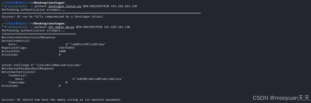 命令利用 proxychains -q 通过代理链隐蔽地执行 set_empty_pw.py 脚本,目标是IP为 192.168.183.130的域控制器(WIN-ENS2VR5TR3N)。此操作旨在利用Zerologon漏洞,将目标域控制器的机器账户密码重置为空,为后续完全控制域控、获取域管理权限奠定决定性基础。