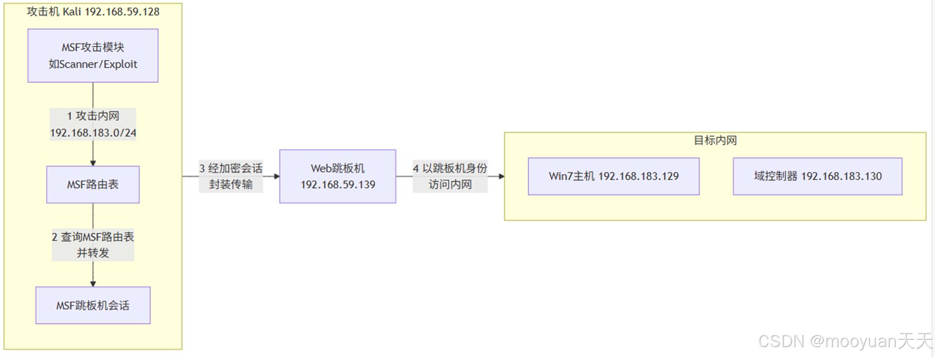 作用 :它实现了 "代理"功能,让你无需在目标内网中部署额外的代理工具,就能直接使用 MSF 的全套工具集对内网进行横向移动。
