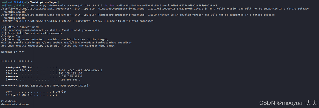 命令通过 proxychains -q 在代理环境下,使用Impacket工具包中的 wmiexec.py 脚本,并利用提供的NTLM哈希以Pass-The-Hash方式,无需明文密码即可认证为用户 administrator,从而在目标域控制器192.168.183.130上获取一个交互式的命令执行shell,实现远程控制。
