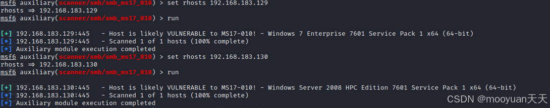 | use auxiliary/scanner/smb/smb_ms17_010 set rhosts 192.168.59.129 run set rhosts 192.168.59.130 run |