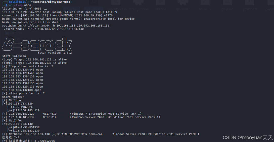 - 1. 内网探测:使用Fscan扫描192.168.183.0/24网段,发现MS17-010漏洞主机。