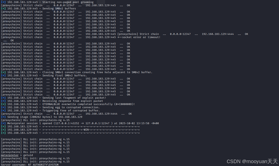 在监听木马成功的msf Web会话上执行如下MSF永恒之蓝漏洞渗透,通过Metasploit框架利用MS17-010永恒之蓝漏洞,对内网目标192.168.183.129发起攻击,通过绑定式TCP载荷在目标系统建立Meterpreter会话,实现远程代码执行和系统控制。