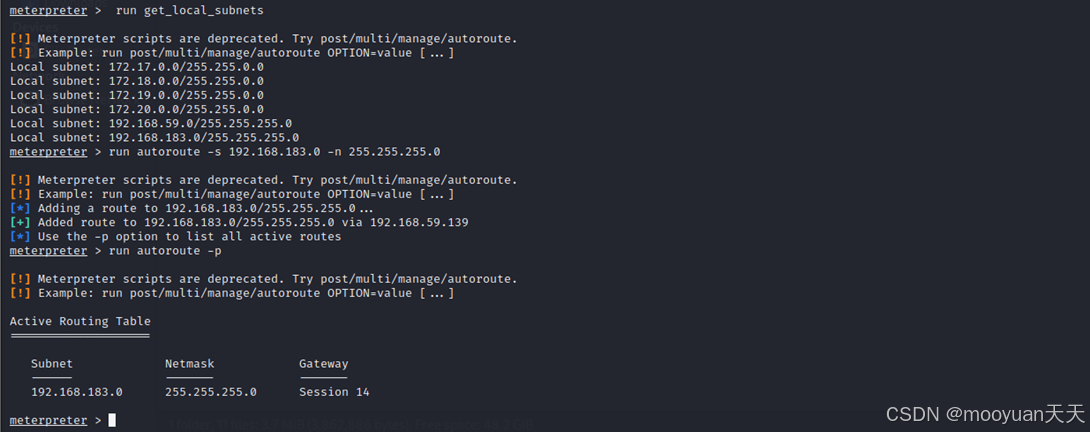 | run get_local_subnets run autoroute -s 192.168.183.0 -n 255.255.255.0 |