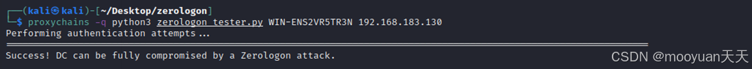 命令使用 proxychains -q 在指定代理(如Socks)下安静地执行 python zerologon_tester.py DC$ 192.168.183.130,其目的是通过代理网络隐蔽地对IP为 192.168.183.130的域控制器(WIN-ENS2VR5TR3N)进行Zerologon漏洞检测,以验证该高危漏洞是否存在。