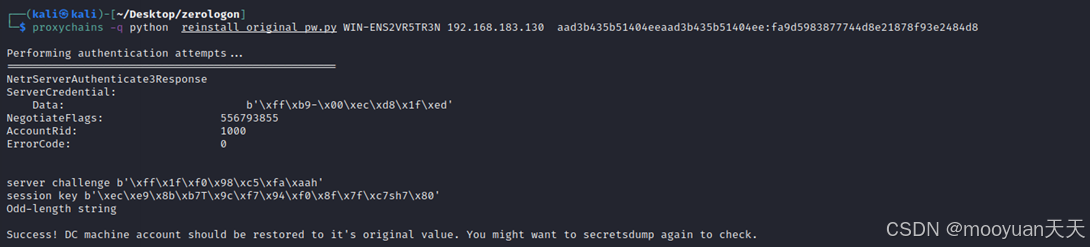通过代理隧道执行Zerologon漏洞利用脚本,在成功利用CVE-2020-1472漏洞将域控制器WIN-ENS2VR5TR3N(IP:192.168.183.130)的机器账户密码重置为空后,使用指定的空NT哈希(aad3b435b51404eeaad3b435b51404ee:fa9d5983877744d8e21878f93e2484d8)进行认证并恢复域控制器的原始密码,以维持域环境稳定性或避免被发现。