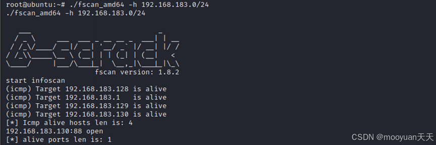 首先为fscan_amd64扫描工具添加可执行权限,随后对192.168.183.0/24整个网段进行综合资产发现与漏洞扫描,探测内容包括存活主机等信息。