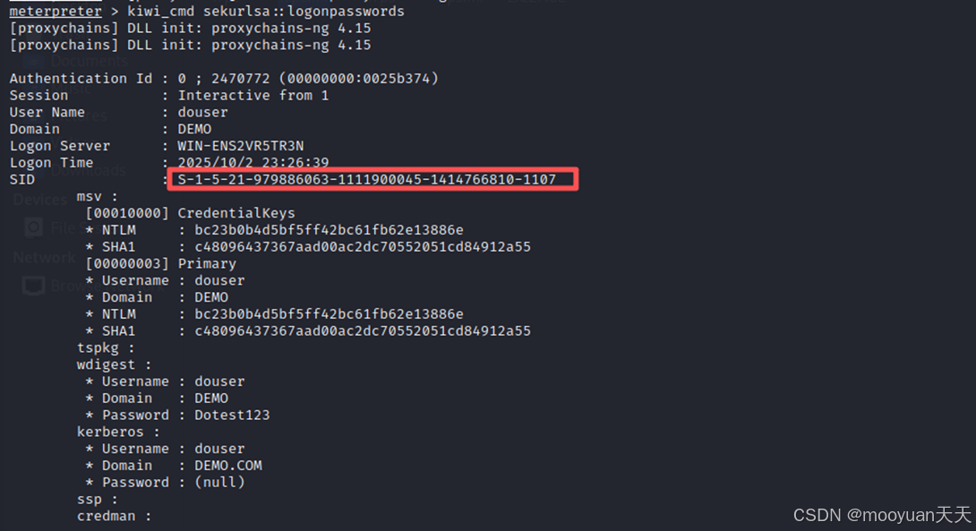 命令通过 proxychains -q 在代理环境下,使用Impacket工具包中的 secretsdump.py 脚本,并指定 -no-pass 和 -just-dc 参数,利用之前Zerologon漏洞已将域控制器(WIN-ENS2VR5TR3N$)密码置空的条件,无需密码即可从 10.10.10.10 远程提取 demo域中的所有域账户哈希值,从而完成对整个域的凭证窃取。