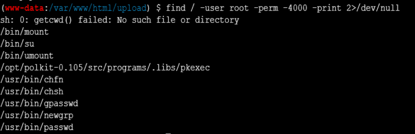 find / -user root -perm -4000 -print 2>/dev/null