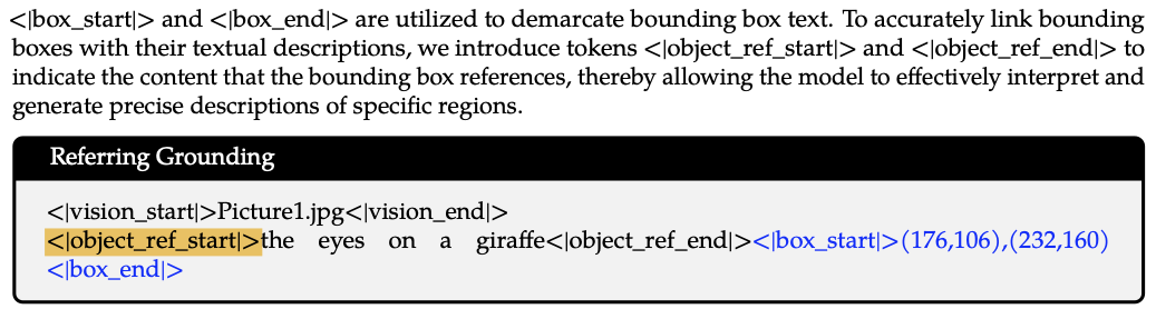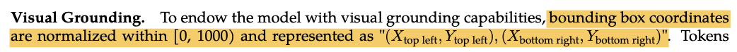Qwen1 VL的visual encoder 其实是一个Q -former的架构,通过256个可学习的token来表示图像,并且这个版本中还不支持视频输入。只支持输出2D normaliezd 的bbox。范围是归一化到[0,1000]的图像grid空间。表示方式是文本,并通过<ref> ,和<box>的方式指代物体和对应的box。