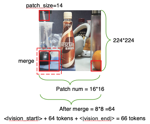 Qwen2 VL中在patch size的基础上还会通过MLP 做一个2*2的merge,进一步减小viusal token输,并加上start 和 end token。