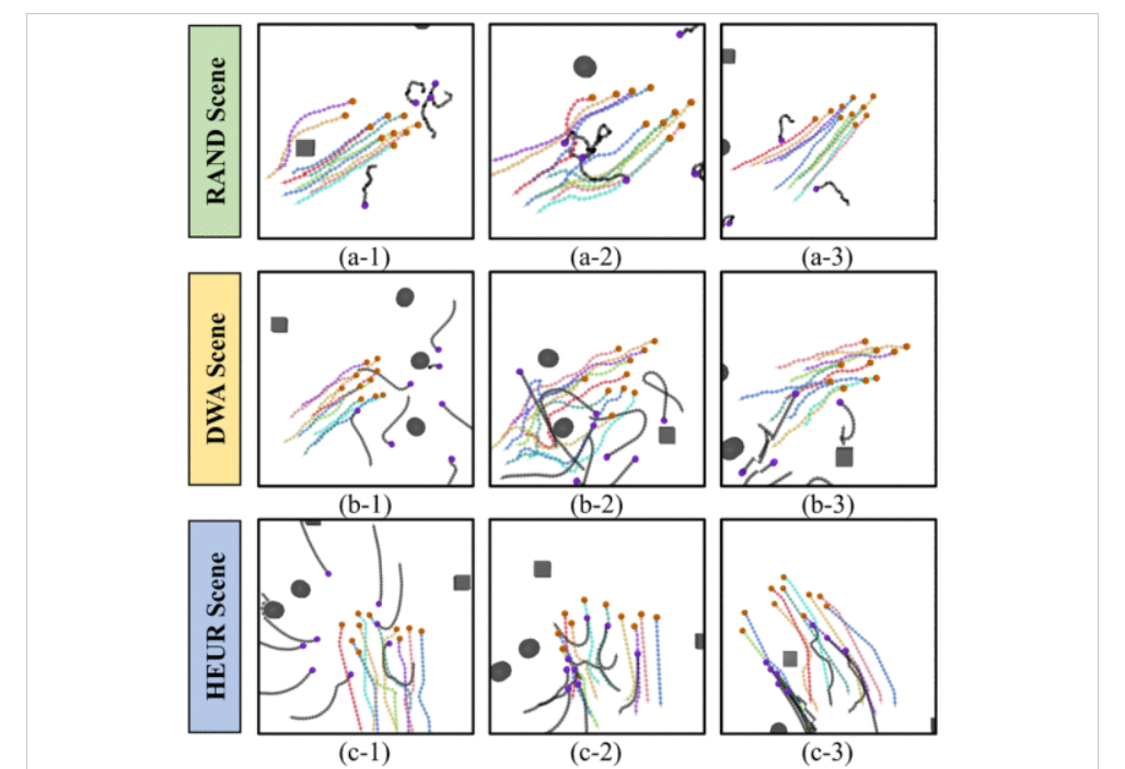 训练环境:扩展为 25m×25m 场景,8 个机器人 + 6 个干扰体 + 5 个静态障碍物,进一步提升任务复杂度。