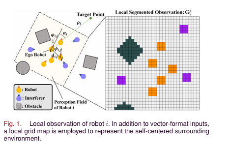 机器人观察(局部范围):自身状态(线性 / 角速度)、目标相对位置(距离 / 角度)、三通道局部网格图(近 3 个时刻,分别标记自由空间 / 静态障碍物 / 机器人 / 干扰体)、周边机器人 / 干扰体的相对状态(距离 / 角度 / 航向差)。