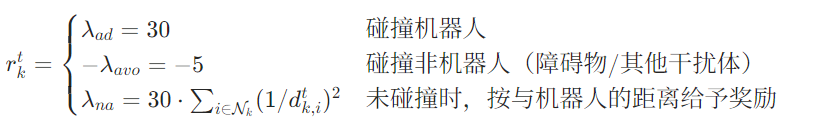 避碰惩罚:碰撞时给予强惩罚;与干扰体距离 <