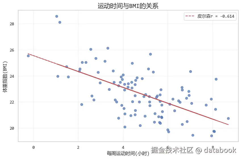 bmi = 25 - 0.5 * exercise_time + np.random.normal(0, 1.5, n_samples)