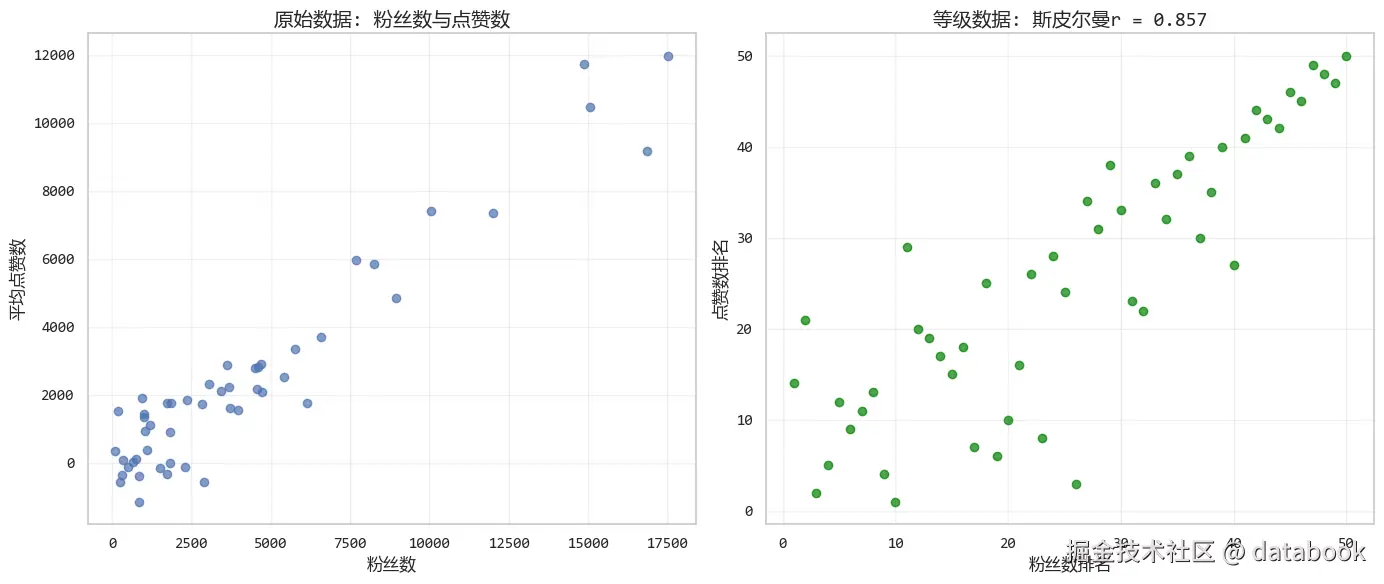 这时候用斯皮尔曼相关系数。它看重的是排名(Rank),而不是具体数值。
