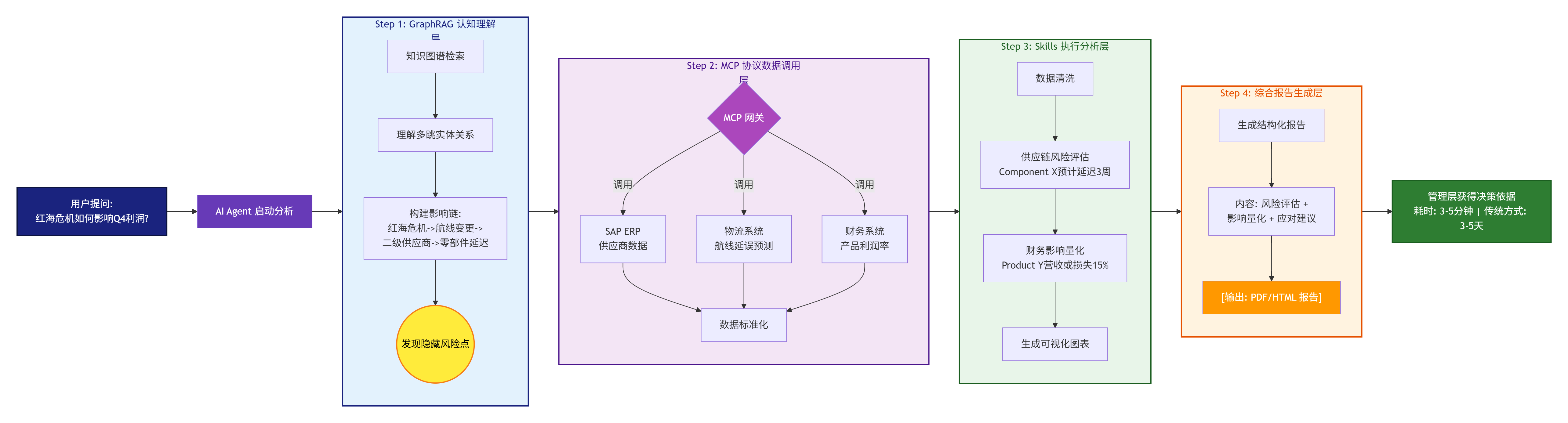 数据输出层 第三支柱: Skills - 功能层 第二支柱: MCP - 集成层 第一支柱: GraphRAG - 认知层 AI Agent 核心层 用户层 自然语言提问 检索知识 语义理解 调用工具 返回数据 执行技能 处理结果 结构化报告