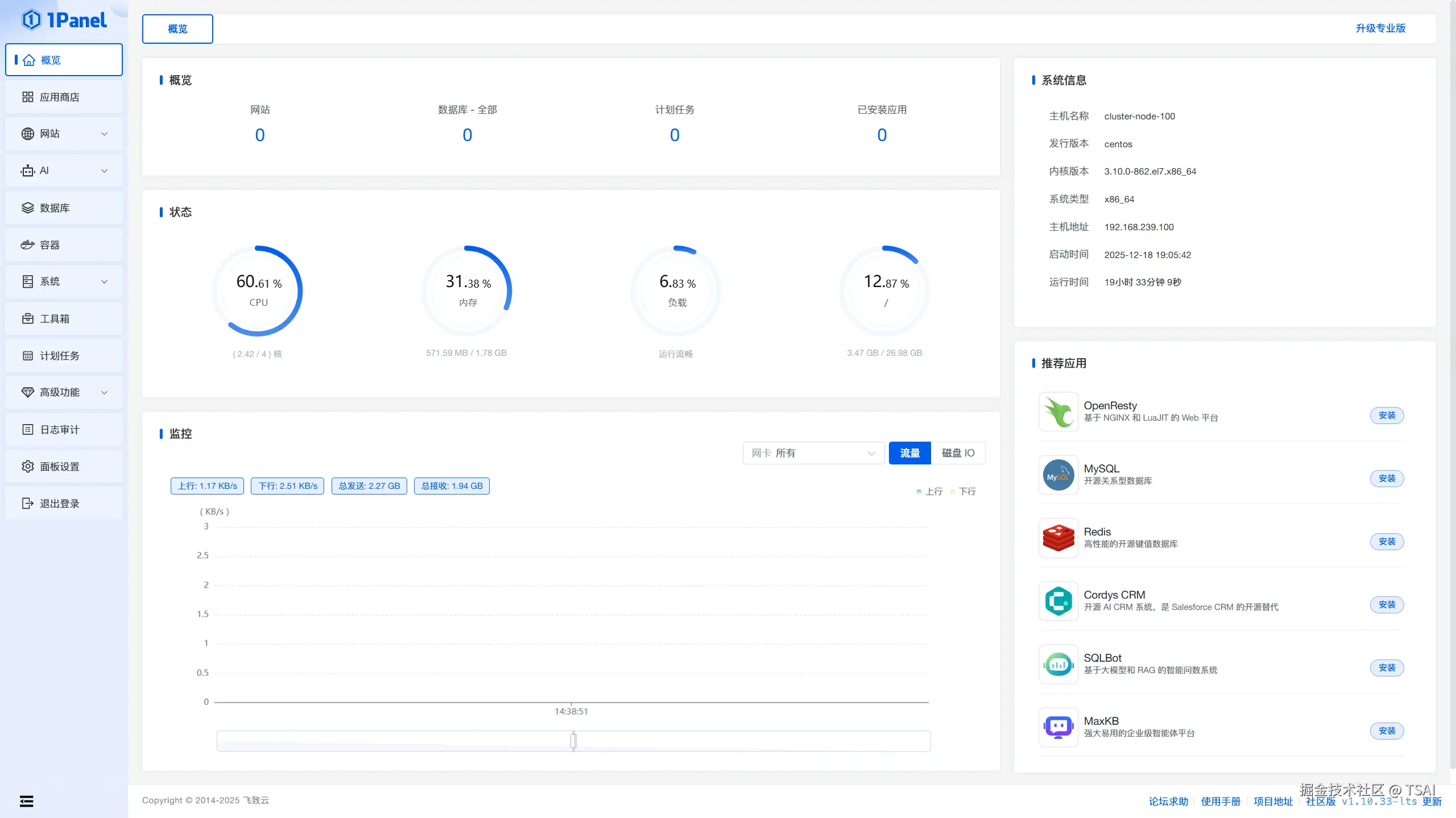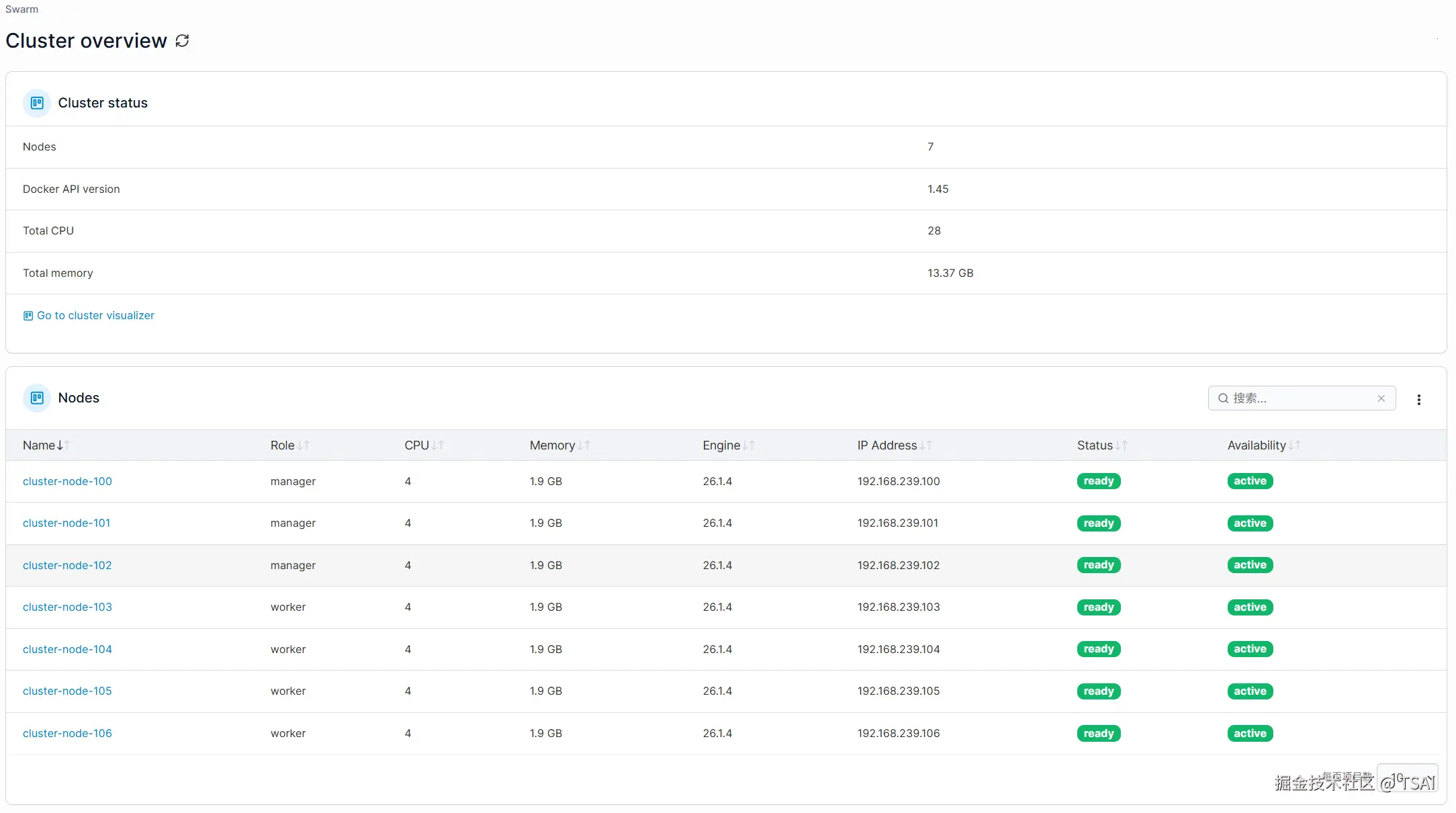 | cluster-node-100 | 192.168.239.100 | 管理节点(Leader) | 2核CPU,2GB内存 | 集群管理、调度决策 |