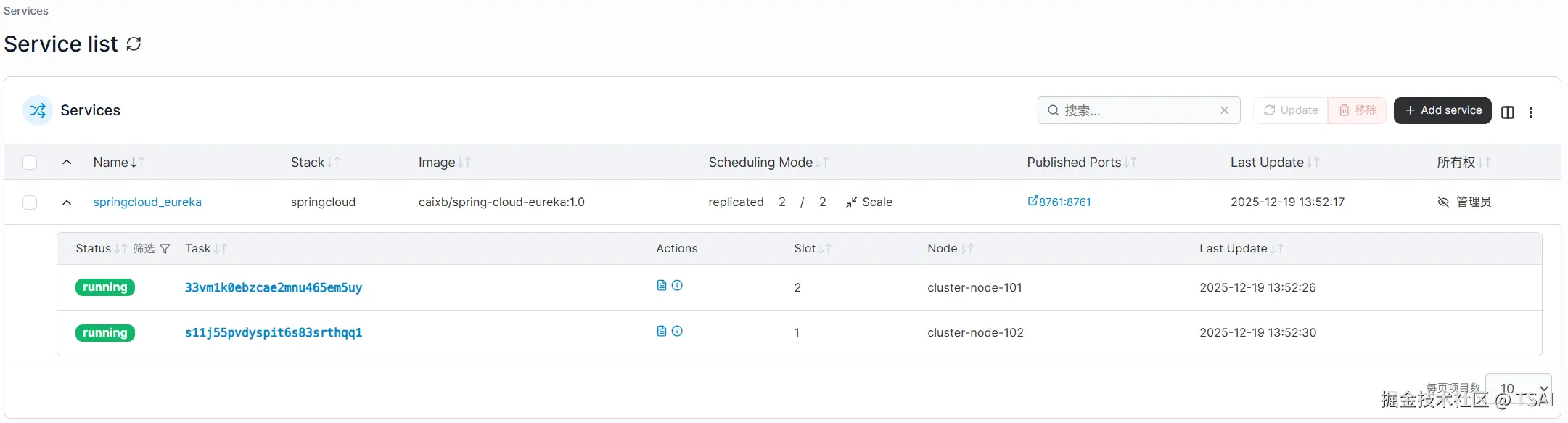 我们能够清楚的看到 eureka 服务创建了 2 个副本服务,Swarm 内置了负载均衡机制,可以自动为服务分配虚拟 IP(VIP)或使用 DNS 轮询(DNS Round-Robin)方式,将外部客户端的请求分发到服务的不同实例。