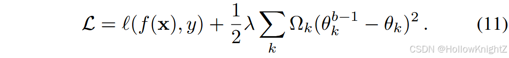 参数正则化项基于两部分计算, θ k b − 1 θ^{b - 1}_k θkb−1 表示学习最后一个任务 D b − 1 D^{b - 1} Db−1 后的第 k k k 个参数。因此, ( θ k b − 1 − θ k ) 2 ( θ^{b - 1}_k - θ_k)^2 (θkb−1−θk)2 表示上一阶段的参数漂移, Ω k Ω_k Ωk 对其进行加权,以保证重要参数不偏离上一阶段。由于最后一个阶段的模型代表的是"旧"知识,对重要参数进行合并可以防止知识被遗忘。