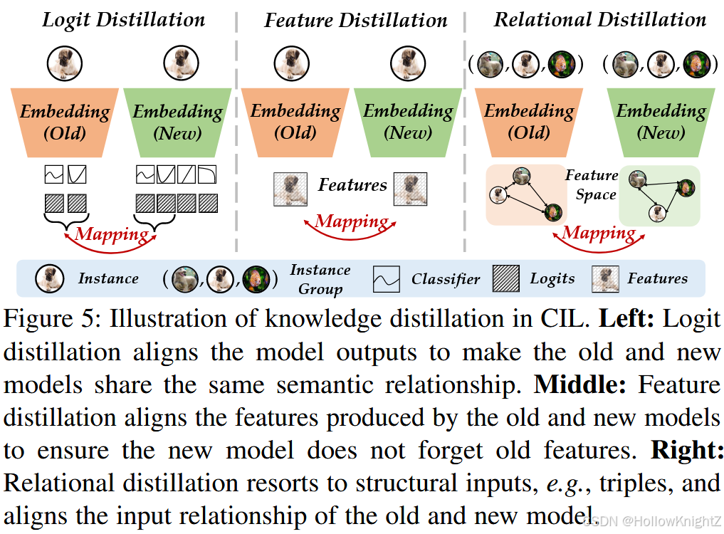 训练数据在学习过程中不断演化,需要不断调整模型。我们可以将上一阶段 f b − 1 f^{b - 1} fb−1 之后的模型称为"旧模型",当前更新的模型f称为"新模型"。假设旧模型对 Y b − 1 Y_{b - 1} Yb−1 中的所有可见类都是一个好的分类器,我们如何利用它来抵抗新模型中的遗忘。为了使旧模型能够辅助新模型,一种直观的方式是知识蒸馏( KD )。KD能够实现从教师模型到学生模型的知识迁移,通过这种知识迁移,我们可以教会新的模型不要忘记。构建蒸馏关系的方法有很多种,我们将这些基于KD的方法分为三个子类,即.logit蒸馏、特征蒸馏和关系蒸馏。