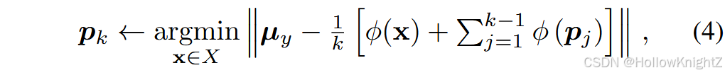 样本选择 :样本是每个类的代表性实例,需要从整个训练集中进行选择。选择样例的一种直观方法是随机采样,这会导致样例可能缺乏多样性。相比之下,一种常用的被称为群羊效应的策略,旨在选择每个类中最具代表性的个体。给定 y y y 类的实例集 X = { x 1 , x 2 , ... , x n } X=\{x_1,x_2,...,x_n\} X={x1,x2,...,xn} ,羊群首先计算当前嵌入 ϕ ( ⋅ ) \phi(·) ϕ(⋅) 的类中心: μ y ← 1 n ∑ i = 1 n ϕ ( X i ) {\mu}y←\frac{1}{n}{\sum}{i=1}^n\phi(X_i) μy←n1∑i=1nϕ(Xi)。然后,他迭代地将实例添加到示例集中心: